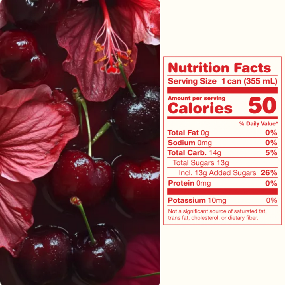 Ingredients: Filtered Carbonated Water, Organic Raw Agave Nectar, Natural Cherry Puree, Citric Acid, Natural Cherry Concentrate, Natural Rosemary Flavoring, Natural Lime Concentrate, Potassium Sorbate, Natural Hibiscus Flavoring, Natural Cherry Flavoring, Hemp Extract